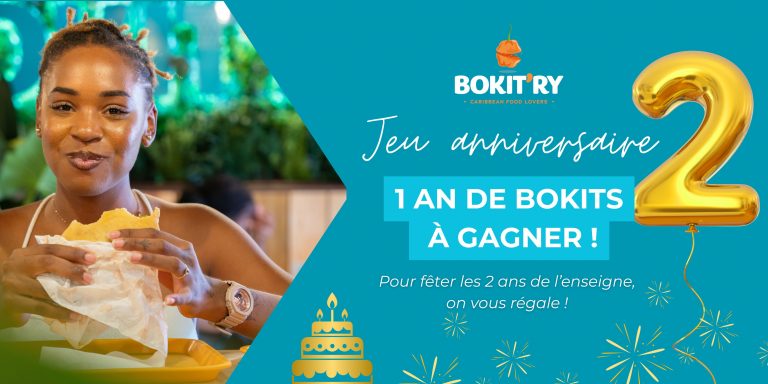 Deux ans déjà que Bokit’ry régale vos papilles avec ses bokits savoureux et son ambiance 100% caribéenne. Pour célébrer cet anniversaire comme il se doit, on vous a préparé une surprise de taille : un grand jeu concours avec une roue à tourner pleine de cadeaux !