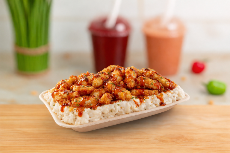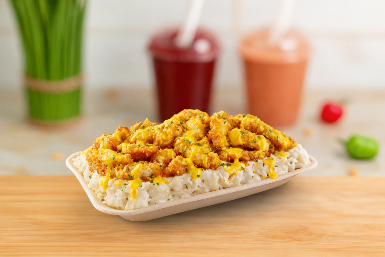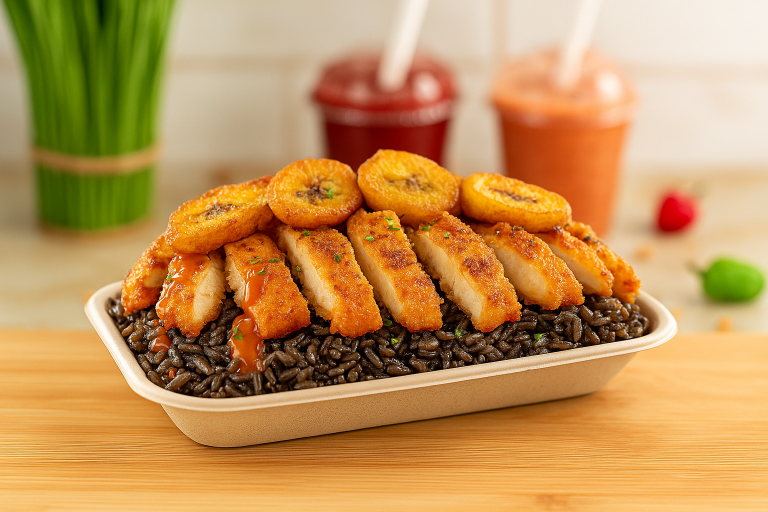 Composé de riz djondjon, sauce blanche secrète maison, tenders croustillants, sauce sucrée, bananes fwites, oignons frits et persil. Ici, on reprend les codes du plat célèbre en version 100 % caribéenne. Le riz djondjon apporte profondeur et caractère, tandis que les bananes fwites viennent ajouter une touche douce et réconfortante. Un parfait équilibre entre tradition et modernité.
